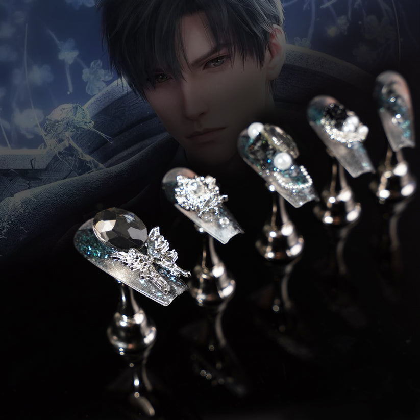 Zayne-inspired nail art that mirrors his calm strength and deep intensity. Subtle gradients, cosmic shimmer, and sharp lines bring a quiet elegance to your fingertips. For those drawn to silence, depth, and beauty beyond the stars.